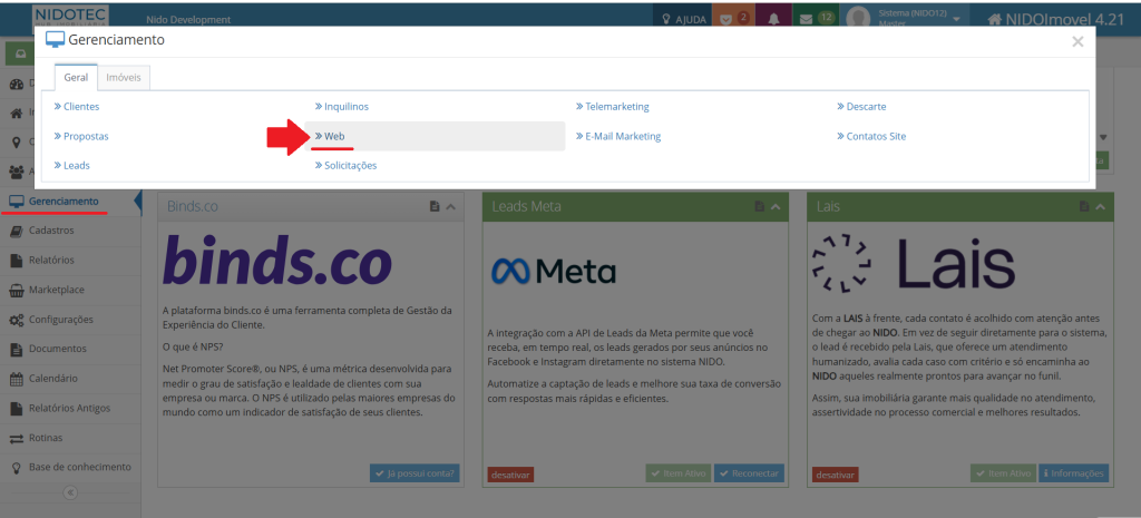 4 – Após a ativação, acesse MENU > GERENCIMENTO > WEB