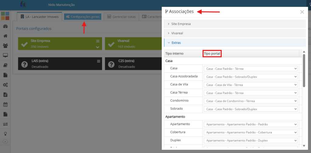 Oriente e auxilie o cliente a realizar as Associações do Tipo Interno e Tipo Portal, através de: Configurações gerais > Extras.