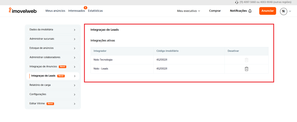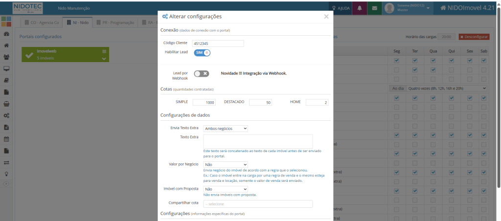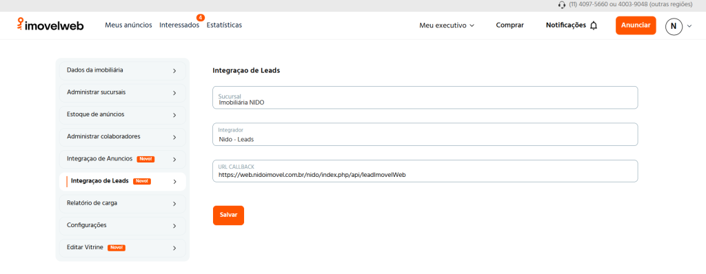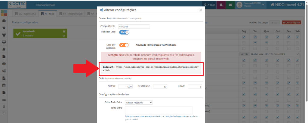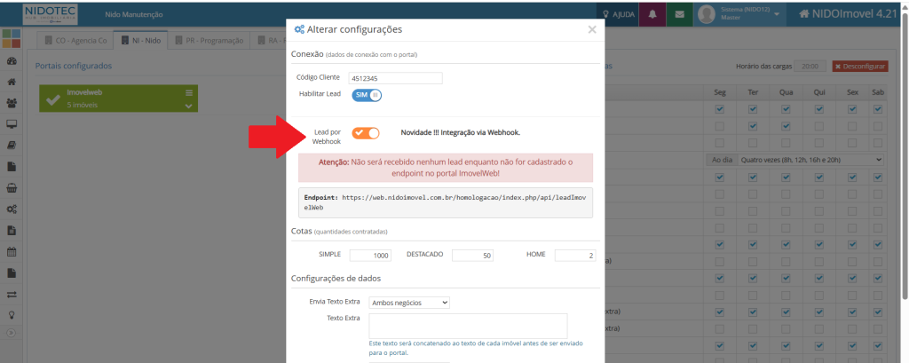 PASSO 1 – Nas configurações do ImóvelWeb, altere a opção LEAD POR WEBHOOK, de NÃO para SIM