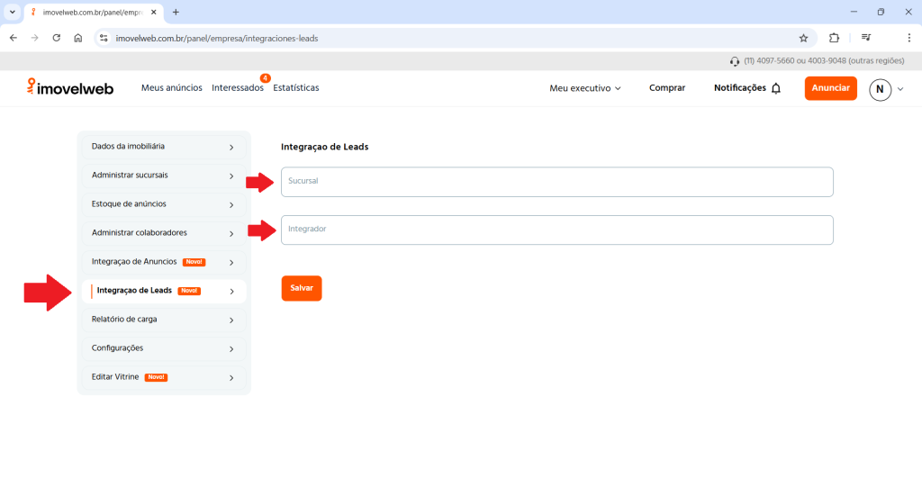 PASSO 3 – No MENU do lado esquerdo, acesse a opção INTEGRAÇÃO DE LEADS