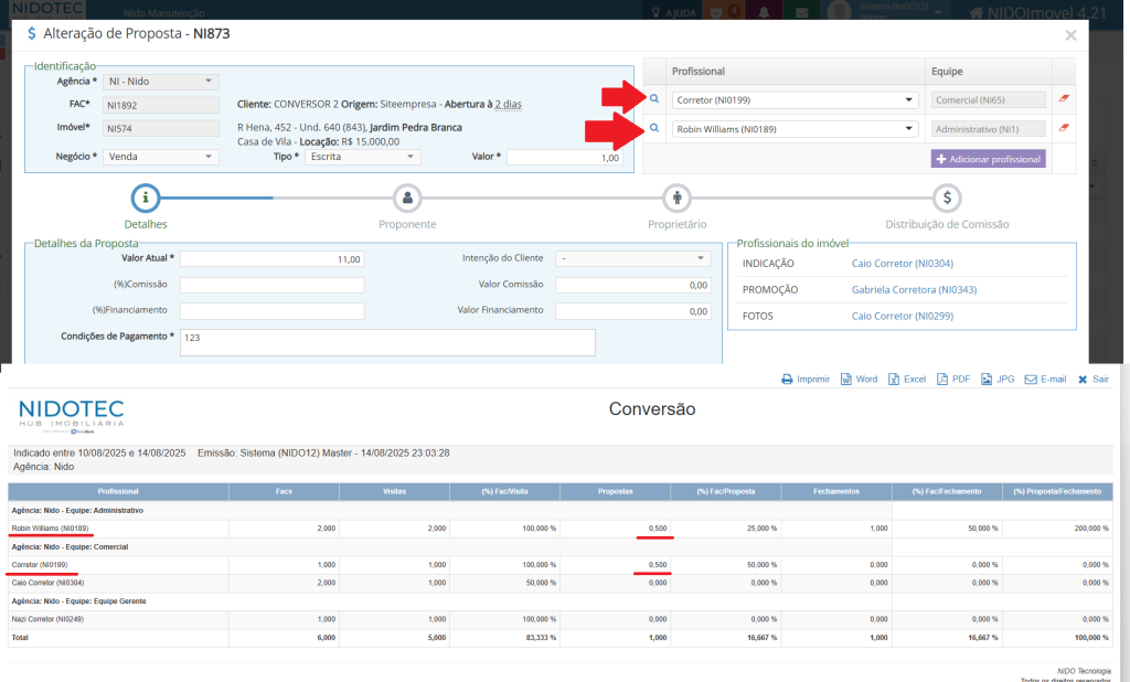 A Proposta exibirá a FRAÇÃO da quantidade de propostas em que o profissional aparece como responsável.